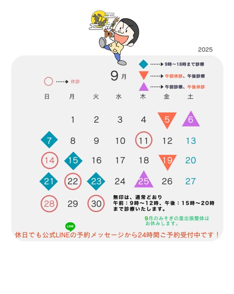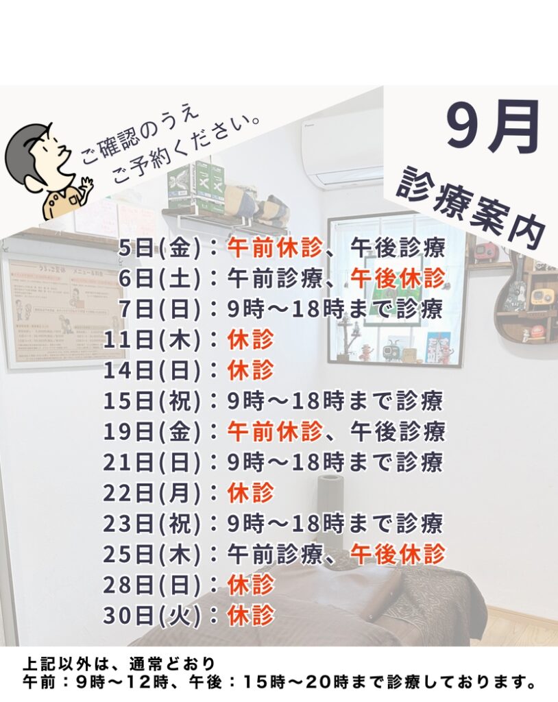 9月は変則的な診療日となっておりますので、ご確認のうえお間違えのないようにご予約お願い致します。