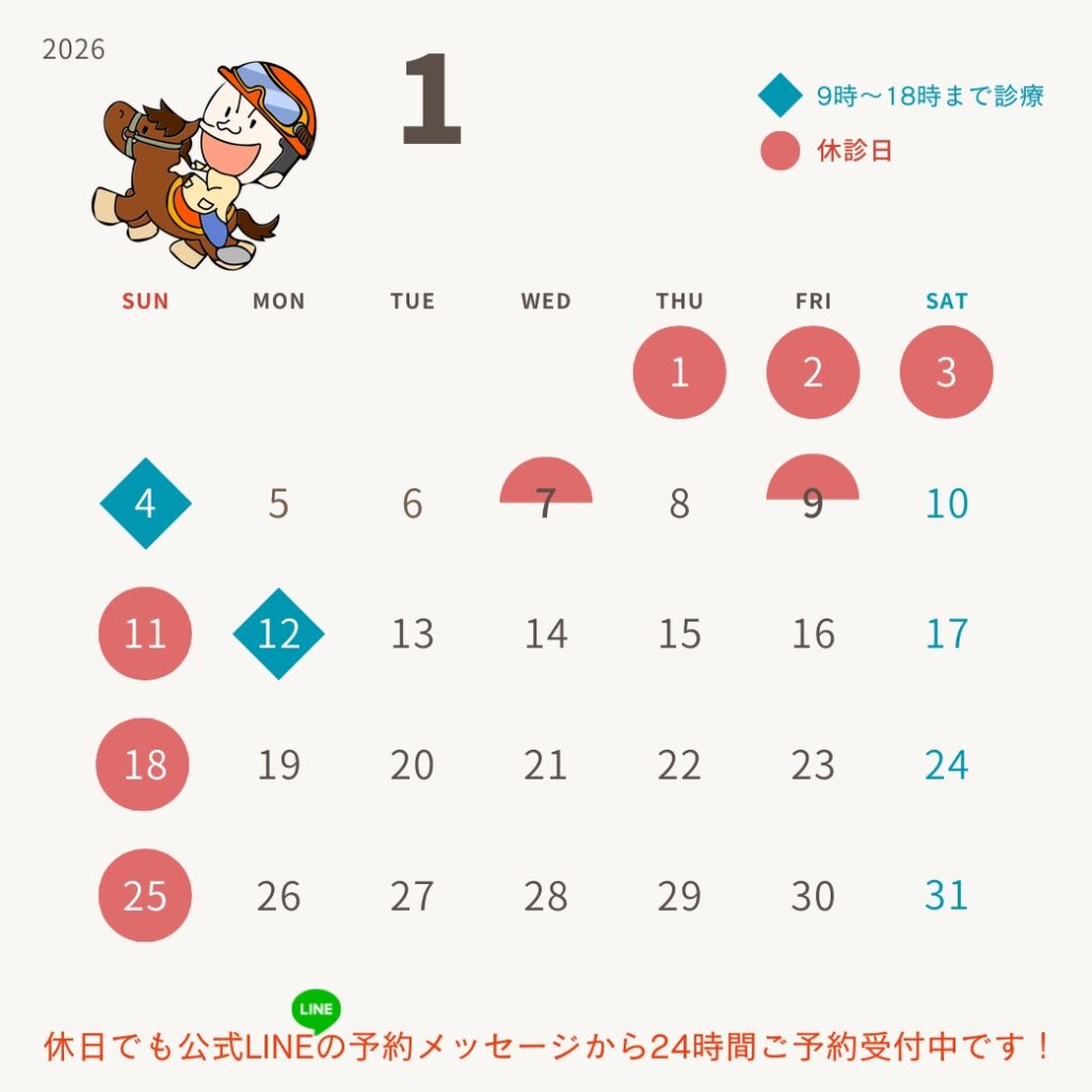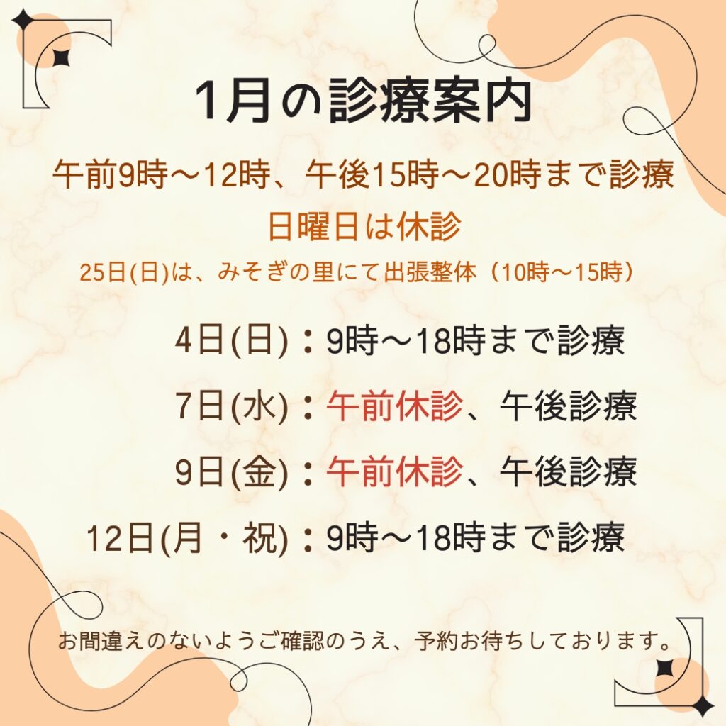 2025年12月30日 / 最終更新日時 : 2025年12月30日 uchikko-seitai お知らせ 1月の診療案内 2026年は1月4日より診療いたします。 4日(日)は、9時〜18時まで診療 7日(水)は、午前休診、午後診療 9日(金)は、午前休診、午後診療 12日(月・祝)は、9時〜18時まで診療 25日(日)は、みそぎの里保健室にて出張整体を行います。(10時〜15時) 休診日でも公式LINEから予約受付中 Follow me! FacebooktwitterHatenaPocket