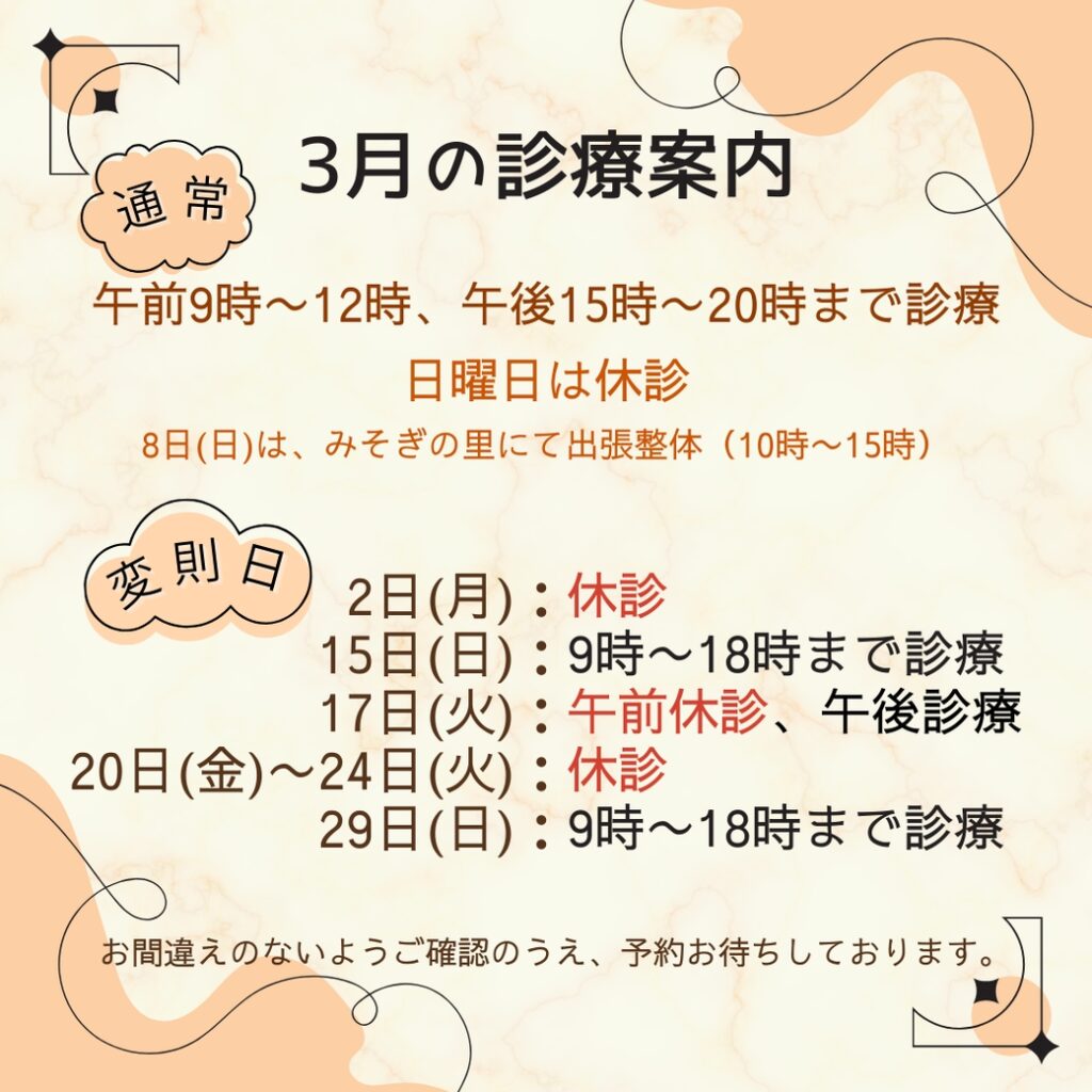 2026年2月27日 / 最終更新日時 : 2026年3月9日 uchikko-seitai お知らせ 3月の診療案内 通常診療は、 午前の部:9時〜12時(最終受付11時) 午後の部:15時〜20時(最終受付19時) 日曜休診 8日(日)は、みそぎの里保健室出張整体です。(10時〜15時) そのほか、 2日(月):休診 15日(日):9時〜18時まで診療 17日(火):午前休診、午後診療 20日(金)〜24日(火):休診 29日(日):9時〜18時まで診療 お間違えのないようご確認のうえ、予約お待ちしております。 休診日でも公式LINEから予約受付中 Follow me! FacebooktwitterHatenaPocket
