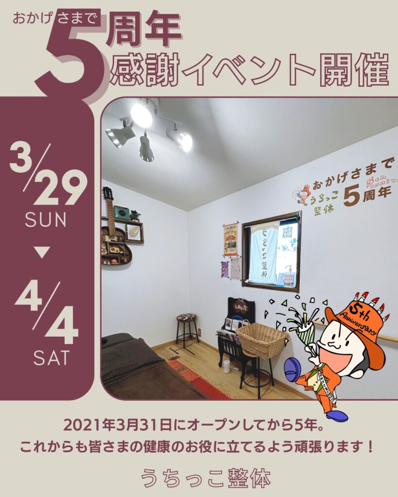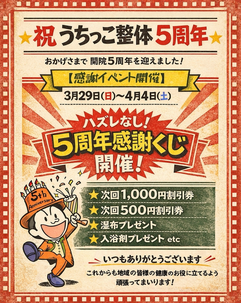 2026年3月14日 / 最終更新日時 : 2026年3月14日 uchikko-seitai お知らせ うちっこ整体開院5周年 おかげさまでうちっこ整体もオープンして5年が経ちました。 これまで多くの方にご来院いただき、さらにご紹介により大きな輪が出来ました。 5周年感謝イベント 3月29日(日)〜4月4日(土) ハズレなし!5周年感謝くじ開催 ご来院時に、くじを引いてもらいます。 主な内容は、 次回1,000円割引券 次回500円割引券 湿布プレゼント 入浴剤プレゼント etc ハズレはありません! これからも地域の皆様のお役に立てるように頑張ってまいります! ぜひこの機会にご来院ください。 Follow me! FacebooktwitterHatenaPocket