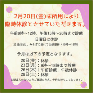 毎月第2・第4日曜日にみそぎの里(旧御祓小学校)1階保健室にて「出張整体」を行います。